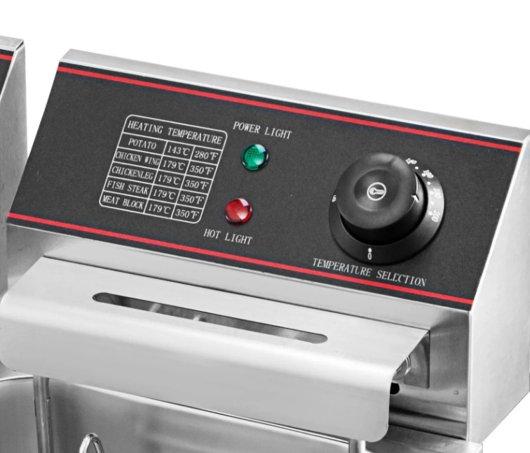 【ATŠĶIRĪGA KONTROLES ZONA】 — Šī fritēšanas ierīce ir paredzēta katras tvertnes neatkarīgai vadībai. Temperatūras diapazons ir no 50 līdz 200 ℃. “Barošanas” un “Karstuma” indikators norāda ierīces darbības statusu. Ir uzlīme ar ieteicamo temperatūru dažādiem pārtikas produktiem atsaucei.