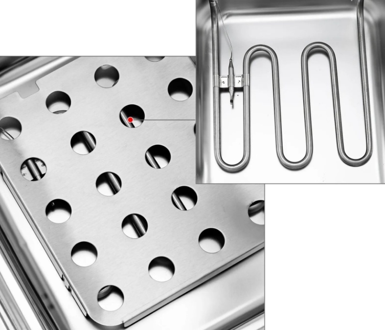 【ĀTRA UZSILDĪŠANA】 — Uzlabota 5 gredzenu sildīšanas caurule vienmērīgākai un ātrākai uzsilšanai salīdzinājumā ar 3 gredzenu caurulēm. Deflektori novērš tiešu groza un sildīšanas caurules saskari un samazina pārtikas atlikumu pielipšanu. Vāki ar rokturi ātrai uzsilšanai un aizsardzībai.
