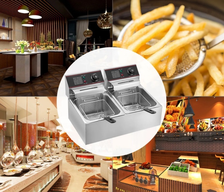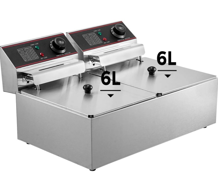 【PLAŠS PIELIETOJUMS】 — Elektriskā fritēšanas ierīce ar pietiekamu vietu vistas, frī kartupeļu, frī kartupeļu, cūkgaļas karbonāžu un daudzu citu produktu cepšanai. Lieliski piemērota ātrās ēdināšanas restorāniem, ceptas vistas kioskiem, ēdināšanas uzņēmumiem utt.