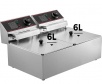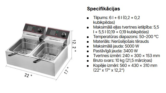 【12 l tilpums】 - 6 l + 6 l tilpuma (0,2 + 0,2 kubikpēdas) elektriskā fritieri ar maksimālo jaudu 2500 W + 2500 W, kas acumirklī bez problēmām apcep lielu daudzumu pārtikas. Divas tvertnes ļauj vienlaikus cept dažādus pārtikas produktus.