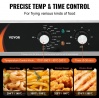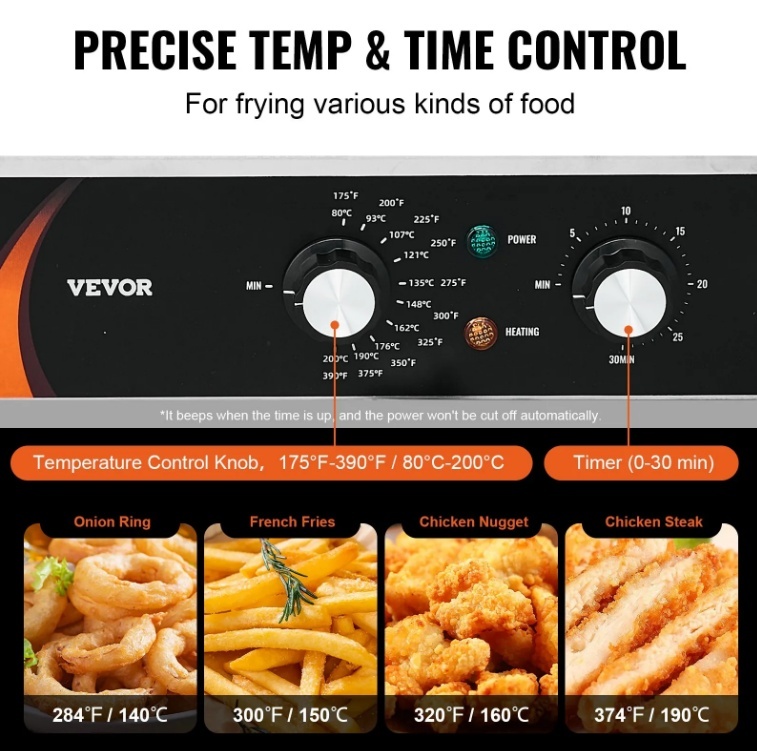 Temperatūras un laika kontrole: Jūs varat viegli regulēt temperatūru no 175°F līdz 390°F (80-200°C). Lai kas arī notiktu, jūs būsiet gatavs ieslēgt siltumu! Šī fritieri automātiski izslēgsies, kad temperatūra pārsniegs 446℉ (230℃) vai temperatūras regulators sabojāsies. Turklāt tas ir aprīkots ar taimeri, lai jūs neko nepalaistu garām.