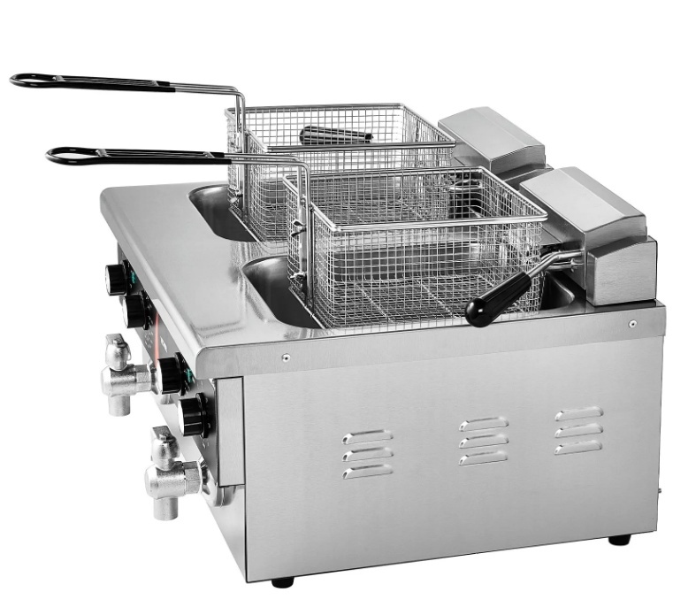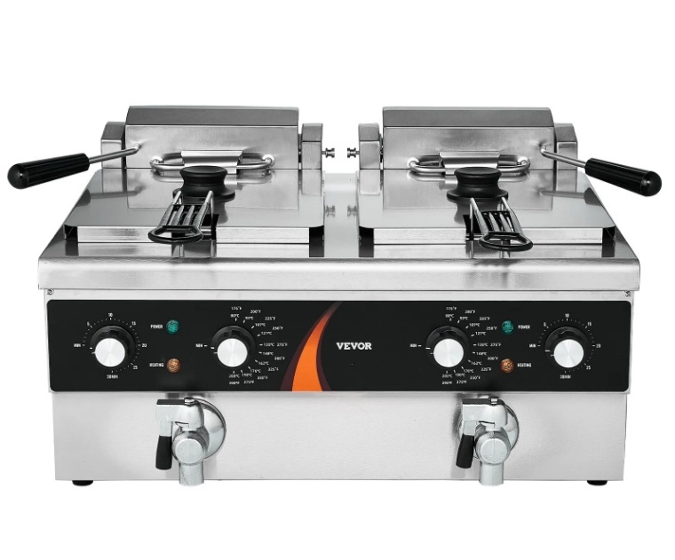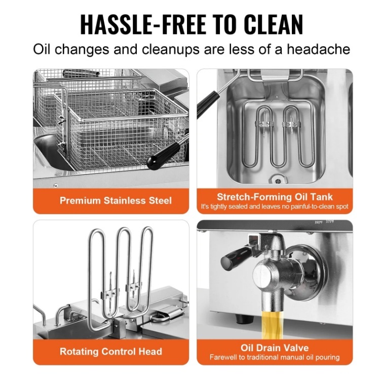 Liela ietilpība: Ar divām atsevišķām eļļas tvertnēm (ūdens ietilpība: maks. 8,5 l katra, eļļas ietilpība: maks. 5,9 l katra), šī komerciālā elektriskā fritieri var atsevišķi cept dažāda veida ēdienus un saglabāt atšķirīgas garšas. Lieliski piemērota delikatesēm, koncesijas stendiem, uzkodu bāriem un ballītēm.